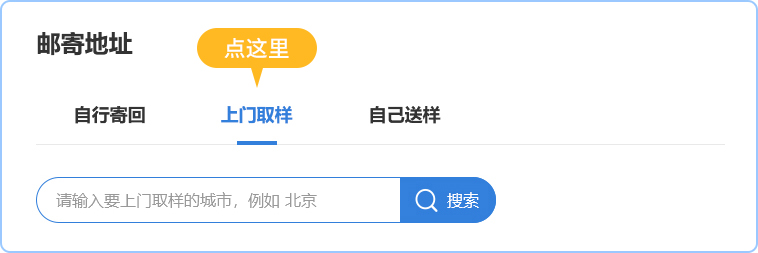 如果您需要上門取樣服務(wù),眾科檢測(cè)平臺(tái)下單時(shí),請(qǐng)選擇上門取樣服務(wù)并輸入上門取樣的城市即可,上門取樣人員會(huì)與您聯(lián)系,無(wú)需快遞,其他市縣需要郵寄。